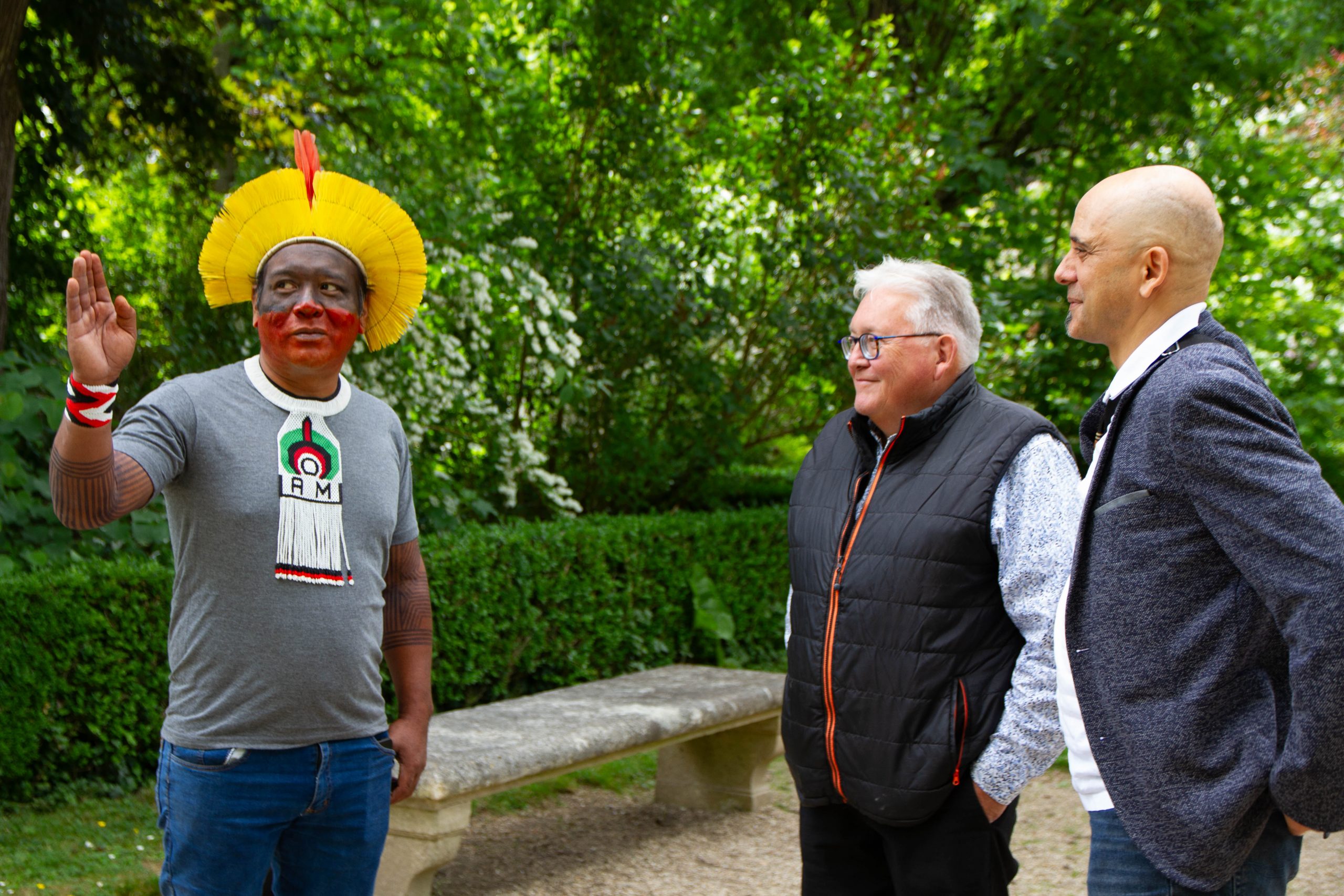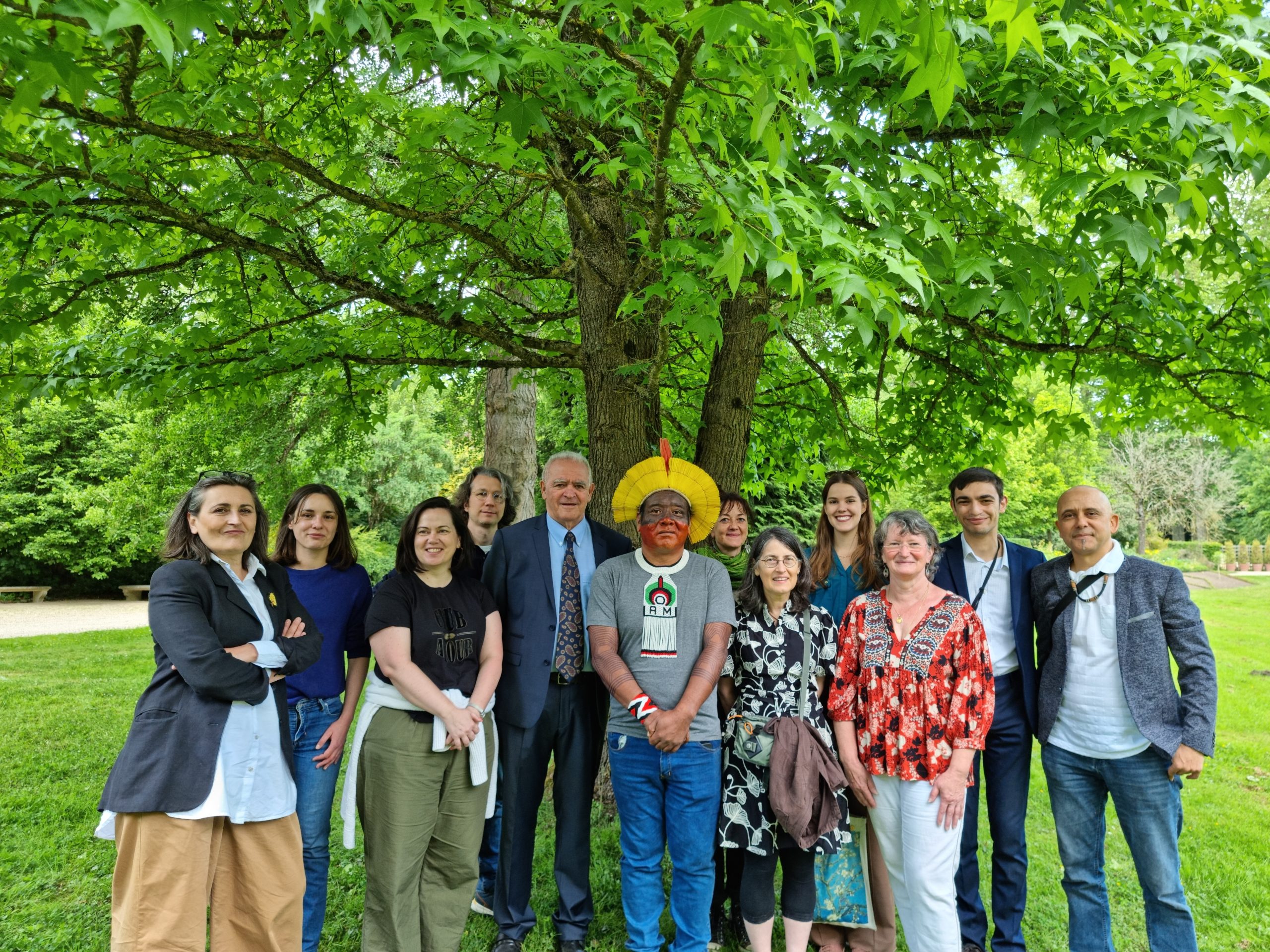 L’après-midi s’est poursuivie à l’Hôtel de Ville de Versailles, où, sous l’impulsion de Planète Amazone, l’Université de Versailles Saint-Quentin-en-Yvelines (UVSQ) a décerné le titre de Docteur Honoris Causa au Cacique Raoni, pour son rôle essentiel dans la préservation des savoirs traditionnels, la défense des droits indigènes et la protection de l’environnement mondial. Cette reconnaissance du monde académique envers un leader indigène est une première historique en Europe.
