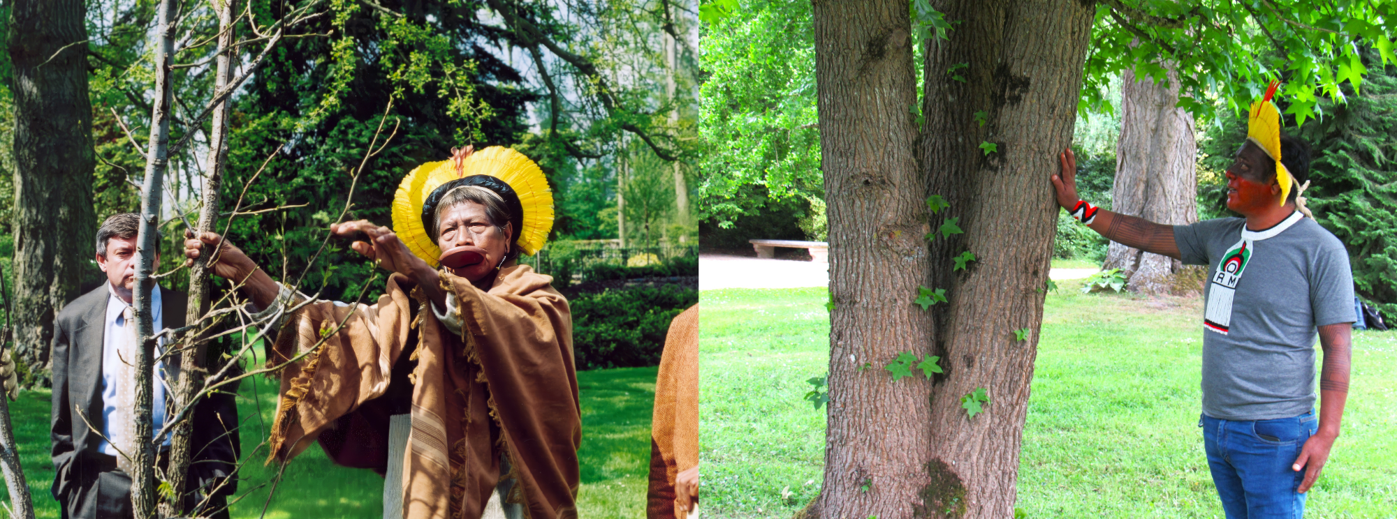 Une cérémonie profondément émouvante s’est tenue le matin du 2 juin dans le Jardin du Roi, au Château de Versailles, autour du Liquidambar offert et planté il y a vingt-cinq ans par le grand Cacique Raoni. Aujourd’hui, prodigieusement imposant, il se dresse à l’image de son protecteur, offert en geste de solidarité de la nation kayapo au domaine de Versailles dévasté par la grande tempête de décembre 1999. Ce geste sacré symbolise l’engagement du Cacique Raoni en faveur de la protection des forêts, et le Liquidambar, l’entité tutélaire des forêts du monde.