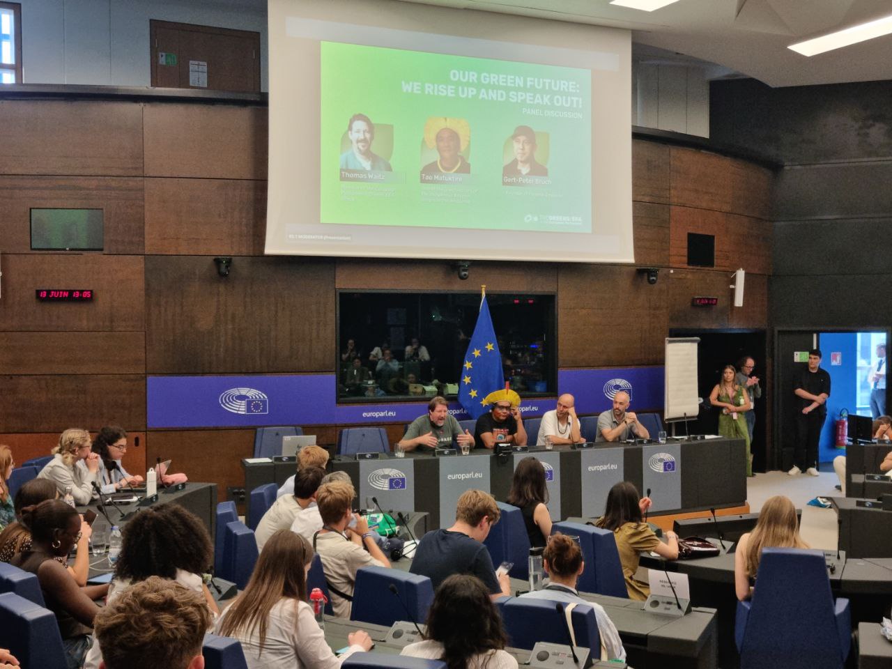 Dans l’après-midi, le Cacique Tau Metuktire et Gert-Peter Bruch ont pris part à un échange de 45 minutes avec près de 200 jeunes, en présence de l’eurodéputé Thomas Waitz.