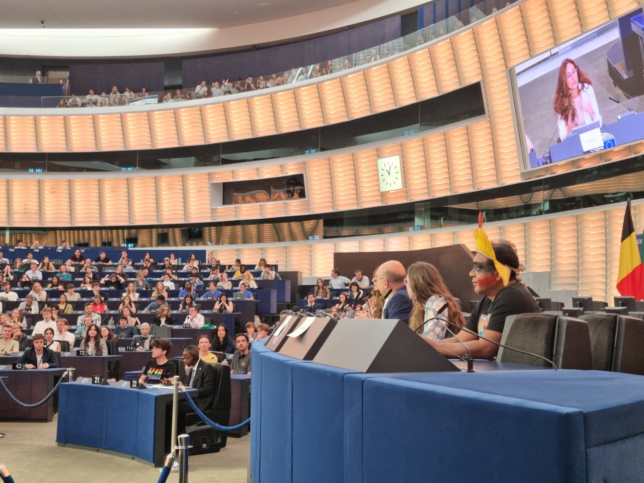 Invité à intervenir en ouverture de la séance plénière de l’EYE 2025, le Cacique Tau Metuktire a pris la parole devant plus de 1 000 jeunes venus de toute l’Europe et du monde entier, réunis dans l’hémicycle du Parlement européen.